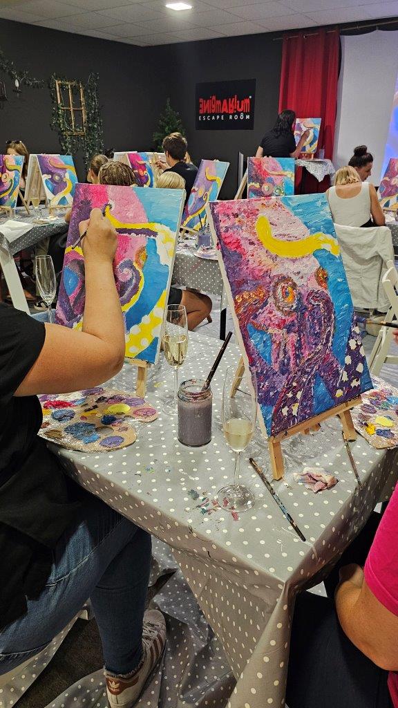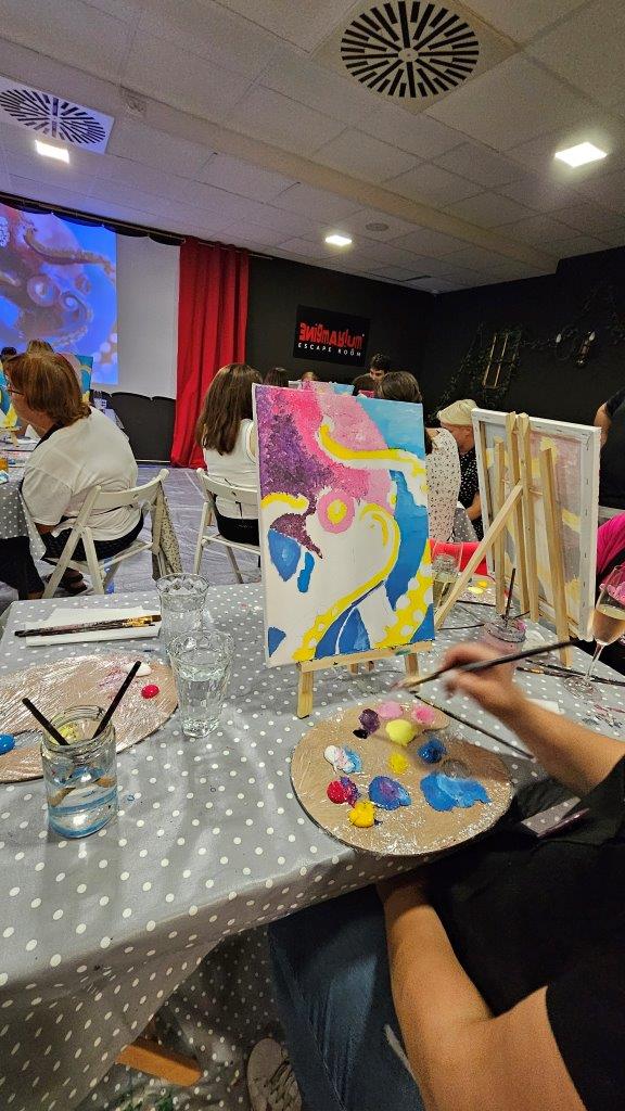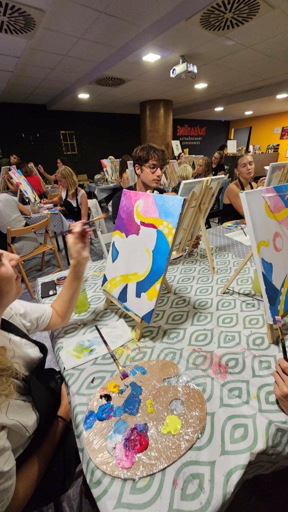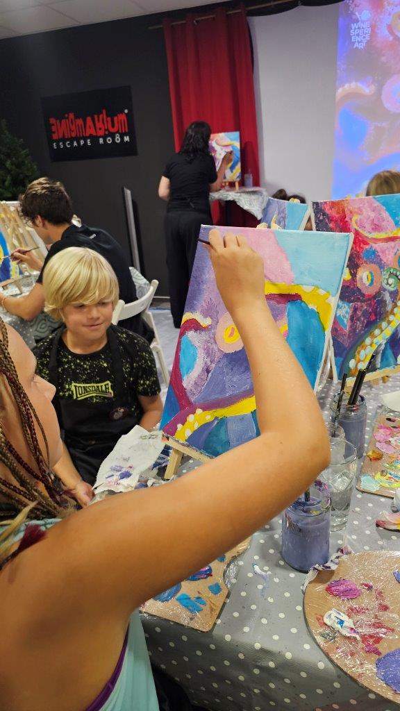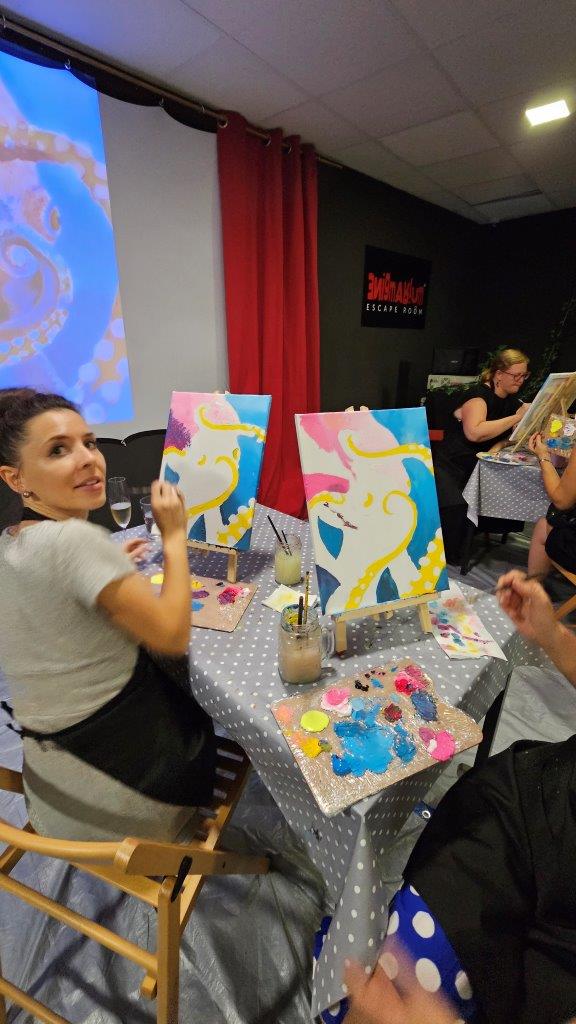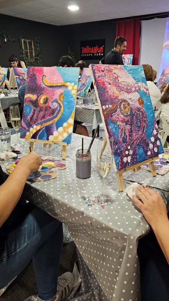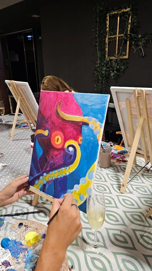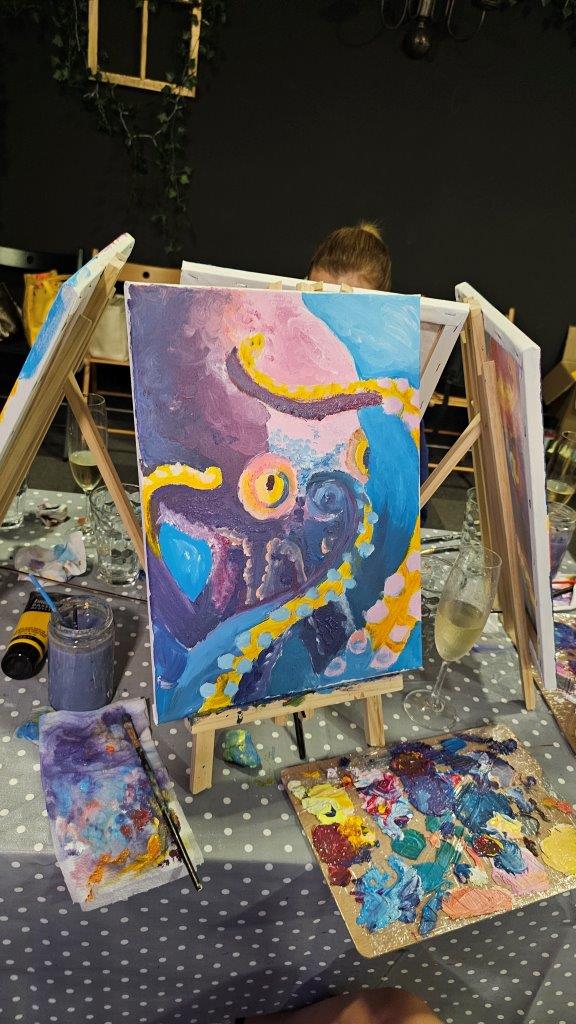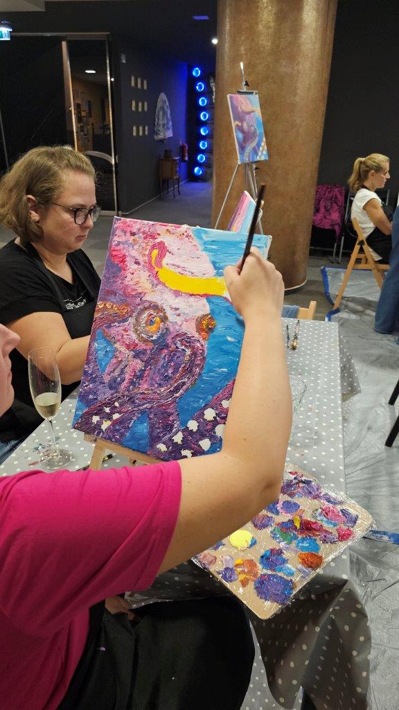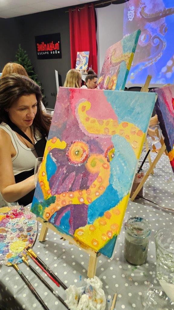 Skupaj smo pod skrbnim vodstvom naših slikark Anke in Inje ustvarili kar 21 unikatnih slik, in prav vsaka je izražala drugačen pogled na to osupljivo bitje. Barve so se zlivale v vijolične, modre in sive tone, hobotnice pa so bile upodobljene v svoji tekoči, skrivnostni obliki. Medtem ko smo ustvarjali, smo uživali v lahkotni penini Ice (Klet brda), ki jo je predstavil Luka in je s svojo svežino in mehurčki lepo dopolnila sproščeno vzdušje. (Mlajši so seveda uživali ob grozdnem soku).