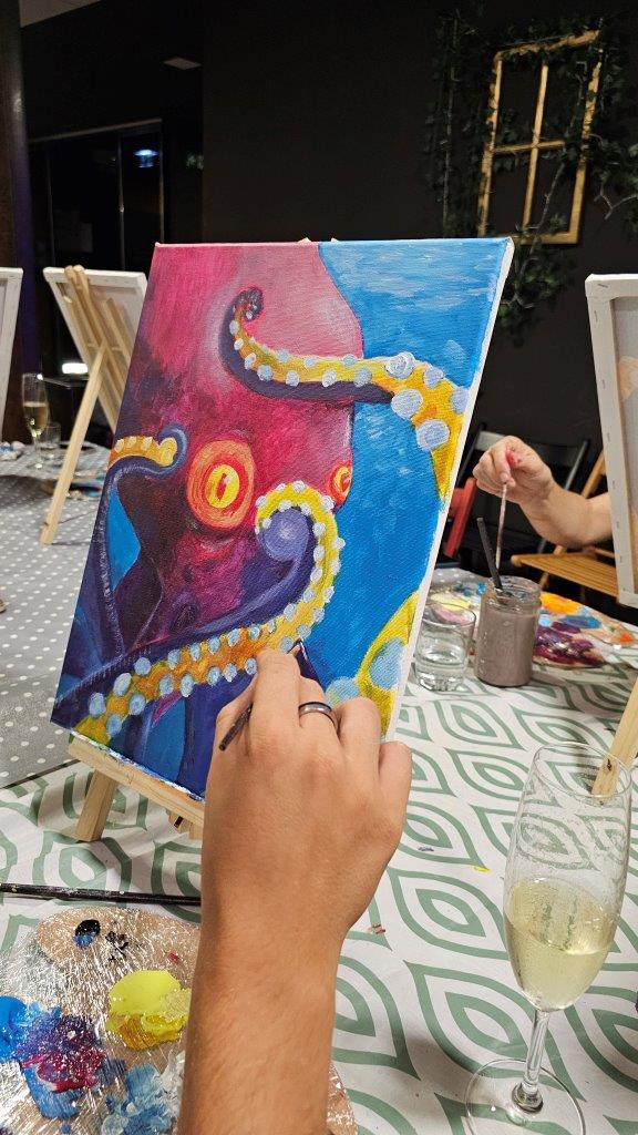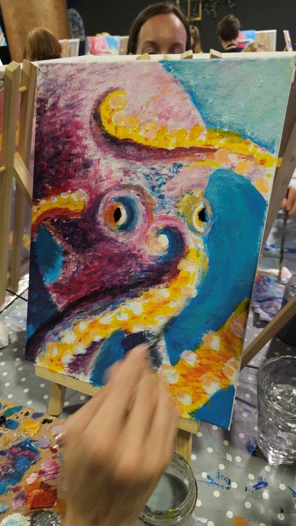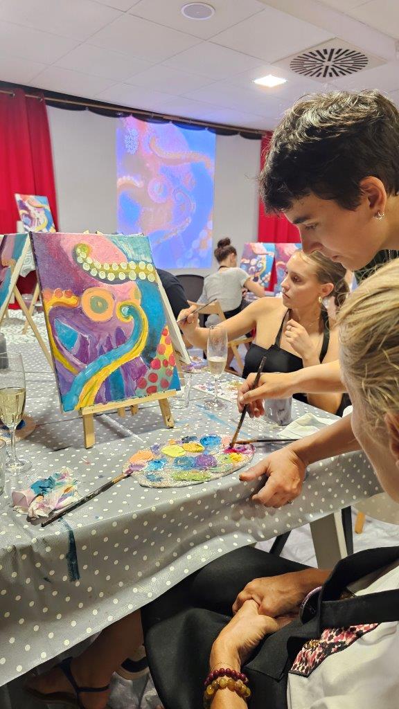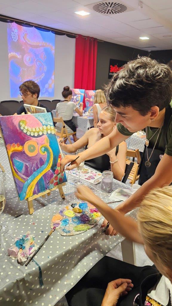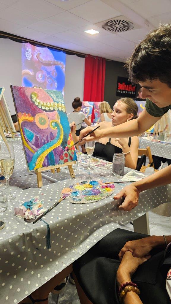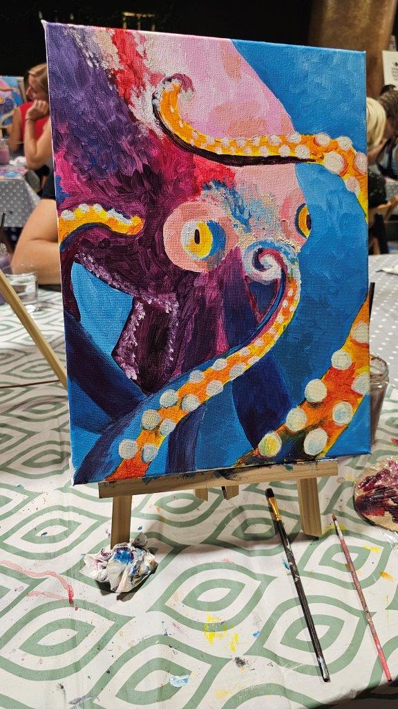 V sredo, 28.avgusta zvečer smo se zbrali na posebni umetniški delavnici – slikanju hobotnice. Čeprav iskanje na Googlu prej prikaže recepte za pripravo hobotnice kot dejstva o njenem izjemnem umu in osupljivi prilagodljivosti, smo se mi odločili, da poudarimo prav njeno eleganco, gibanje in skrivnostnost skozi umetnost. Pravijo, da umetnost poskuša razumeti tisto, kar je očem nevidno, in tokrat smo skušali zajeti skrivnostno dušo hobotnice, njeno lepoto, sposobnost prilagajanja in inteligenco v naravi.