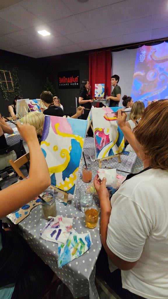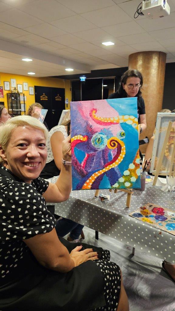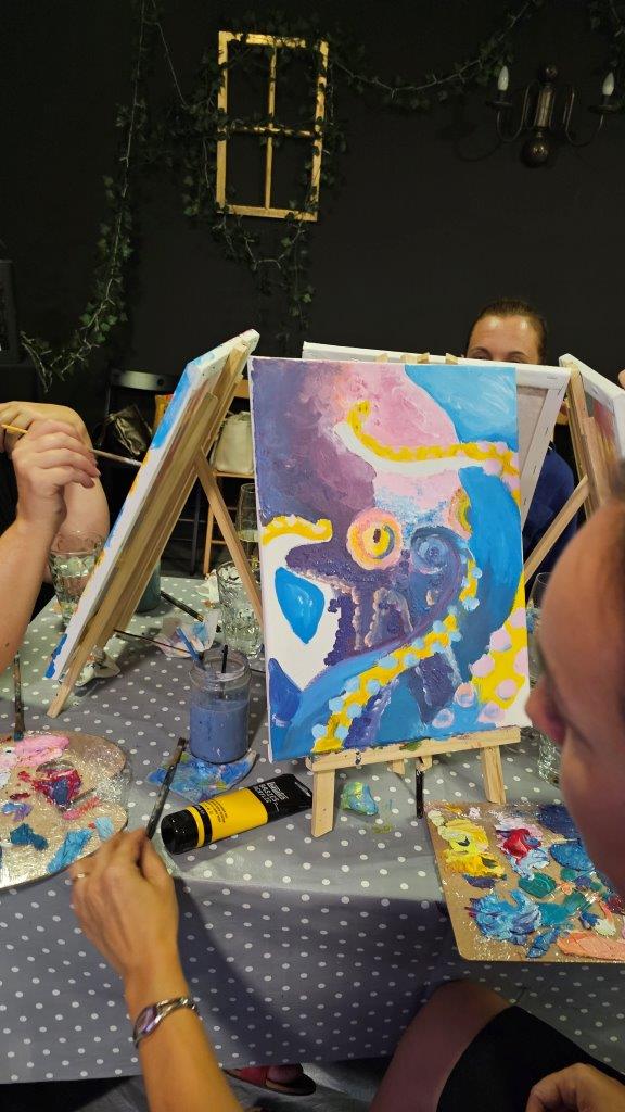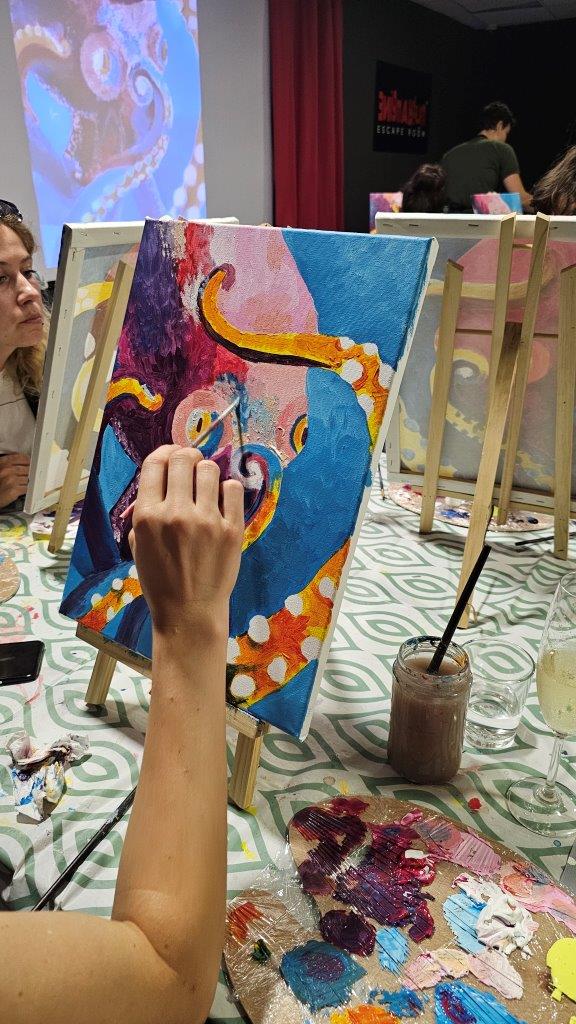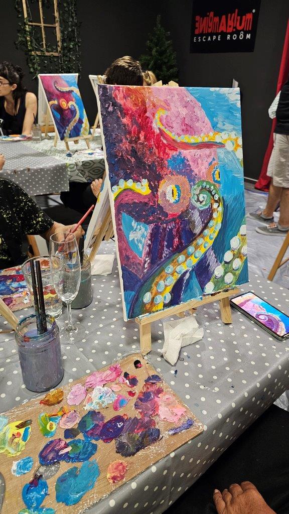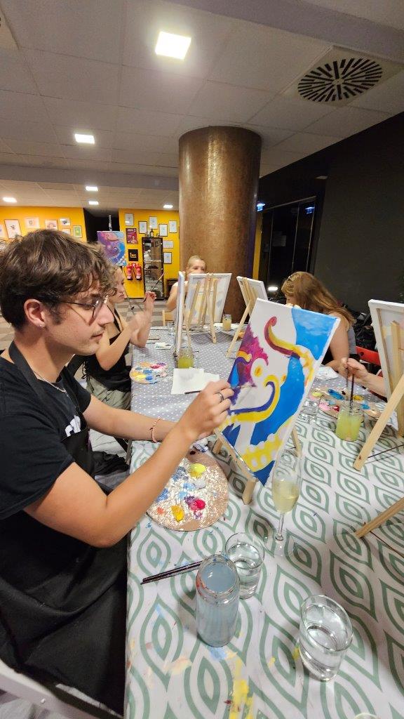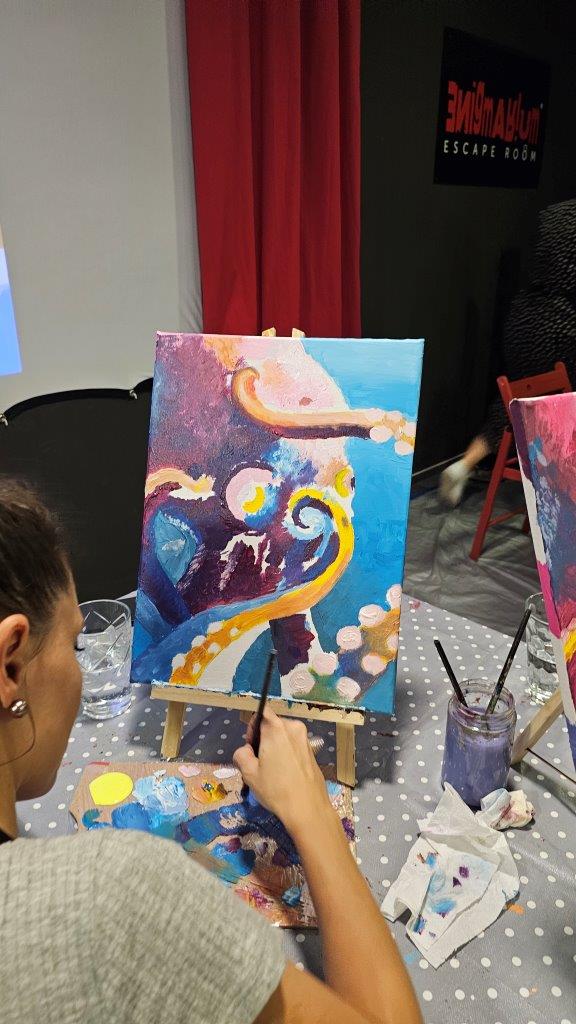 V sredo, 28.avgusta zvečer smo se zbrali na posebni umetniški delavnici – slikanju hobotnice. Čeprav iskanje na Googlu prej prikaže recepte za pripravo hobotnice kot dejstva o njenem izjemnem umu in osupljivi prilagodljivosti, smo se mi odločili, da poudarimo prav njeno eleganco, gibanje in skrivnostnost skozi umetnost. Pravijo, da umetnost poskuša razumeti tisto, kar je očem nevidno, in tokrat smo skušali zajeti skrivnostno dušo hobotnice, njeno lepoto, sposobnost prilagajanja in inteligenco v naravi.