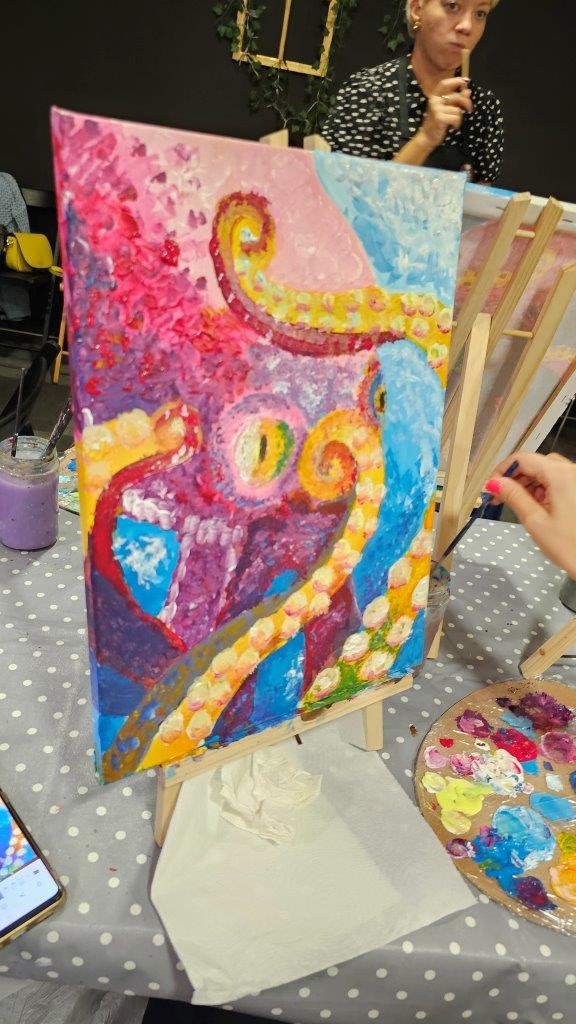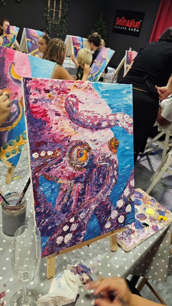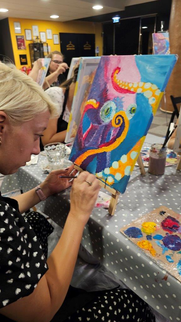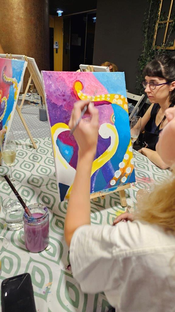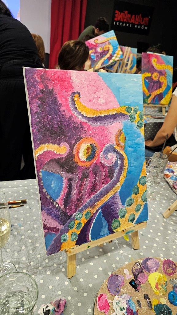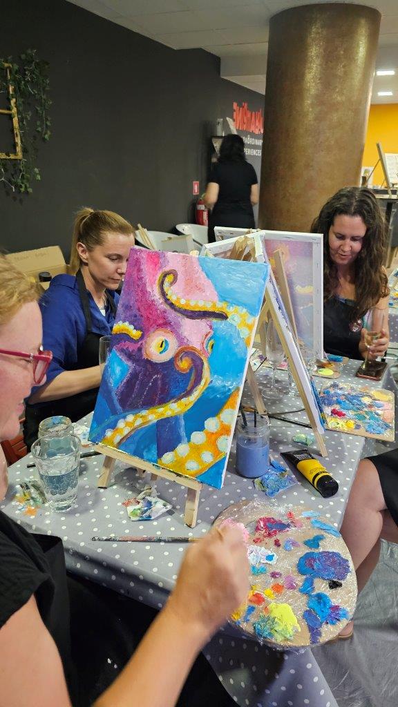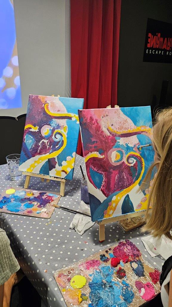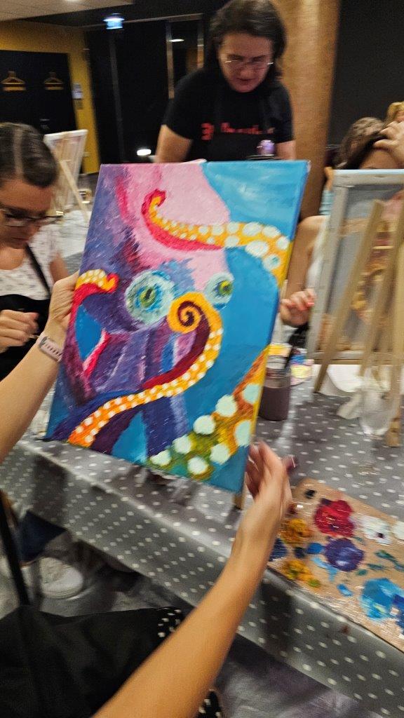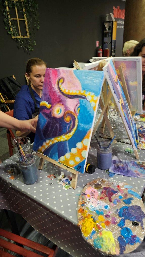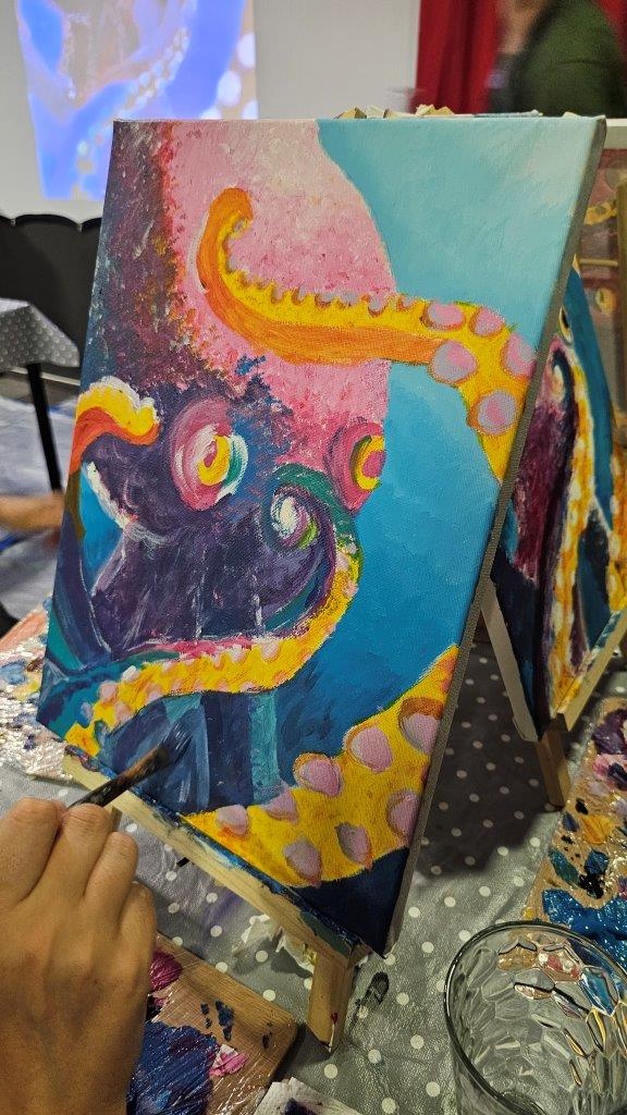 Med ustvarjanjem smo si medsebojno izmenjevali ideje, opazovali tehnike slikanja in se pogovarjali o hobotnici – o njeni pameti, sposobnosti kamuflaže, zapletenih nevralnih mrežah in čustveni kompleksnosti, ki jo morda pogosto spregledamo. Na koncu dneva smo, obdani s 21 slikami hobotnic, slavili umetnost, kreativnost in lepoto narave, ki jo pogosto pozabimo ceniti, ko jo vidimo zgolj skozi kulinarično prizmo. Hobotnica je ta dan postala navdih umetniškega ustvarjanja in globljega razmisleka o njeni veličini.