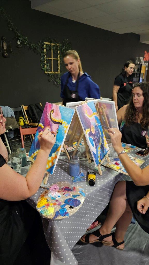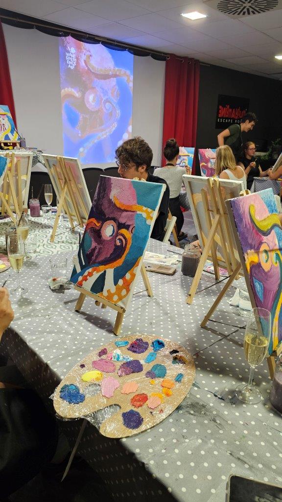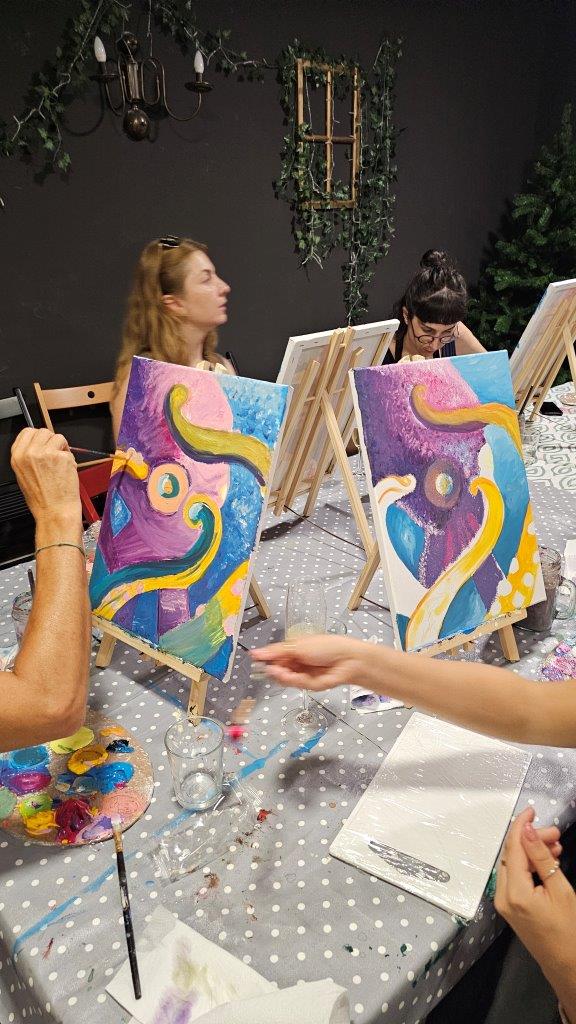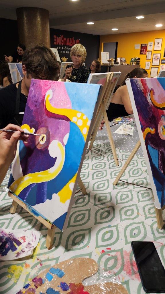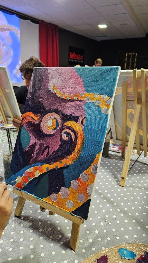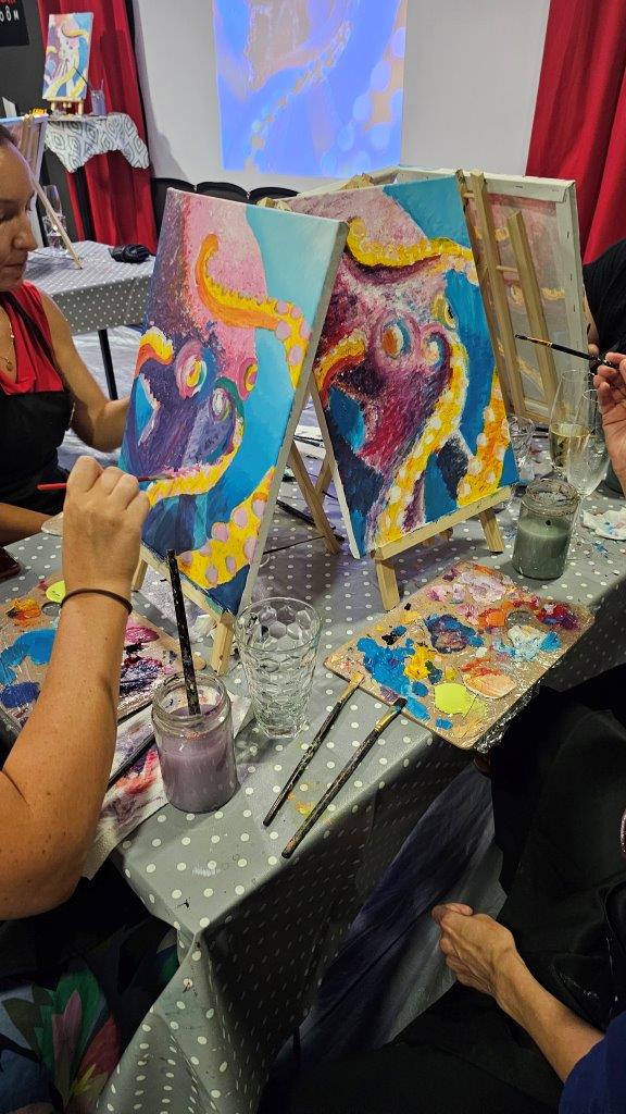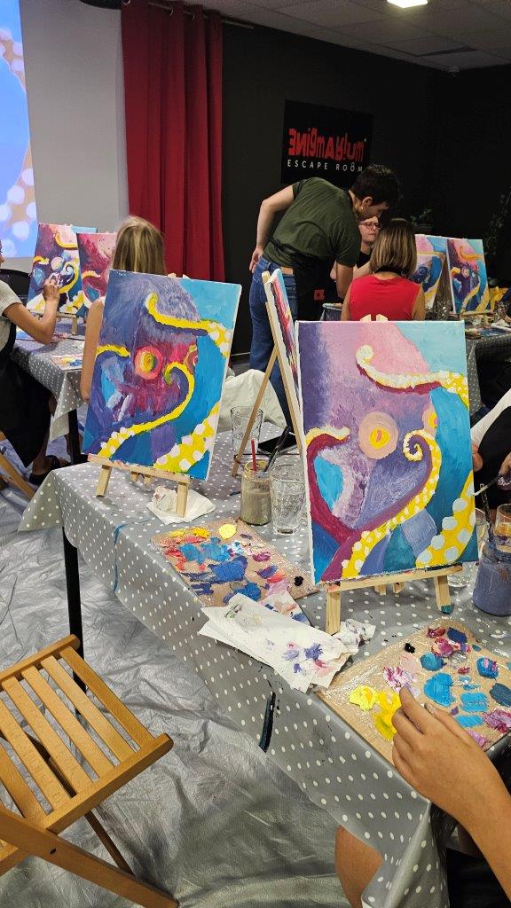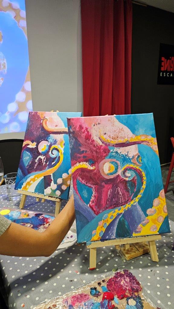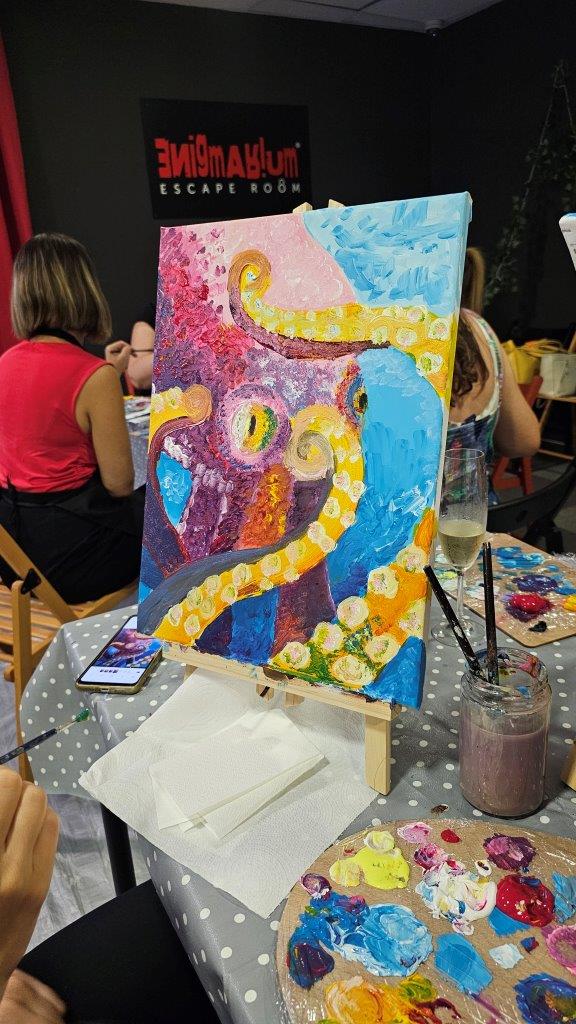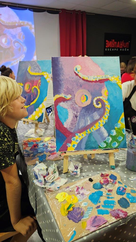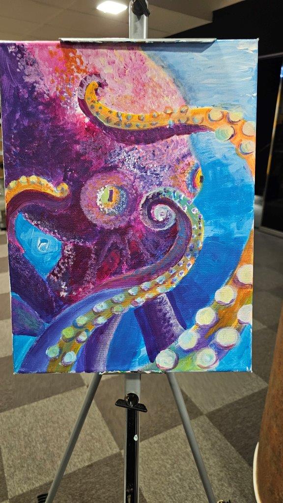 Med ustvarjanjem smo si medsebojno izmenjevali ideje, opazovali tehnike slikanja in se pogovarjali o hobotnici – o njeni pameti, sposobnosti kamuflaže, zapletenih nevralnih mrežah in čustveni kompleksnosti, ki jo morda pogosto spregledamo. Na koncu dneva smo, obdani s 21 slikami hobotnic, slavili umetnost, kreativnost in lepoto narave, ki jo pogosto pozabimo ceniti, ko jo vidimo zgolj skozi kulinarično prizmo. Hobotnica je ta dan postala navdih umetniškega ustvarjanja in globljega razmisleka o njeni veličini.