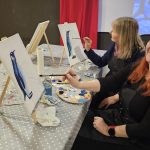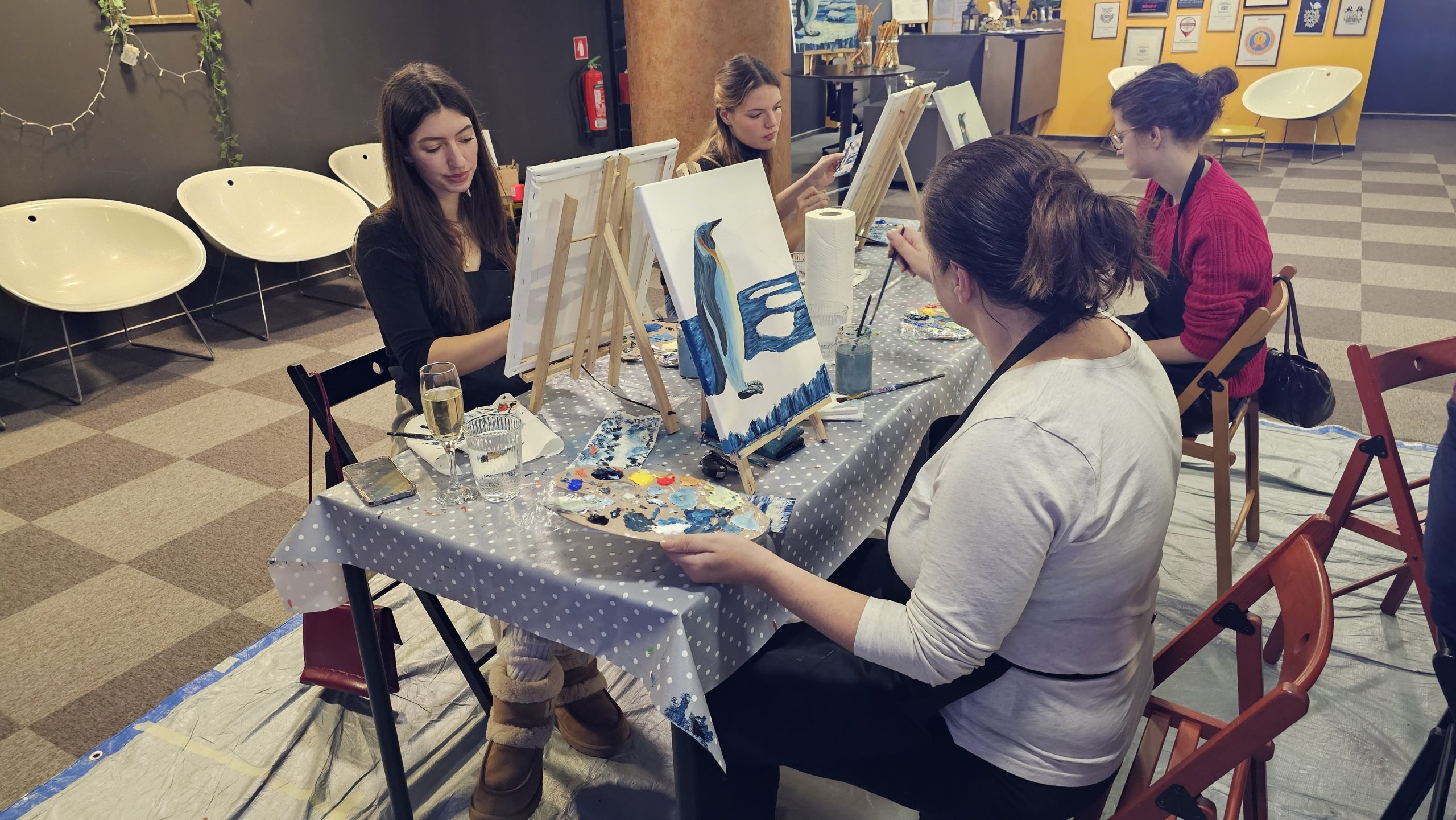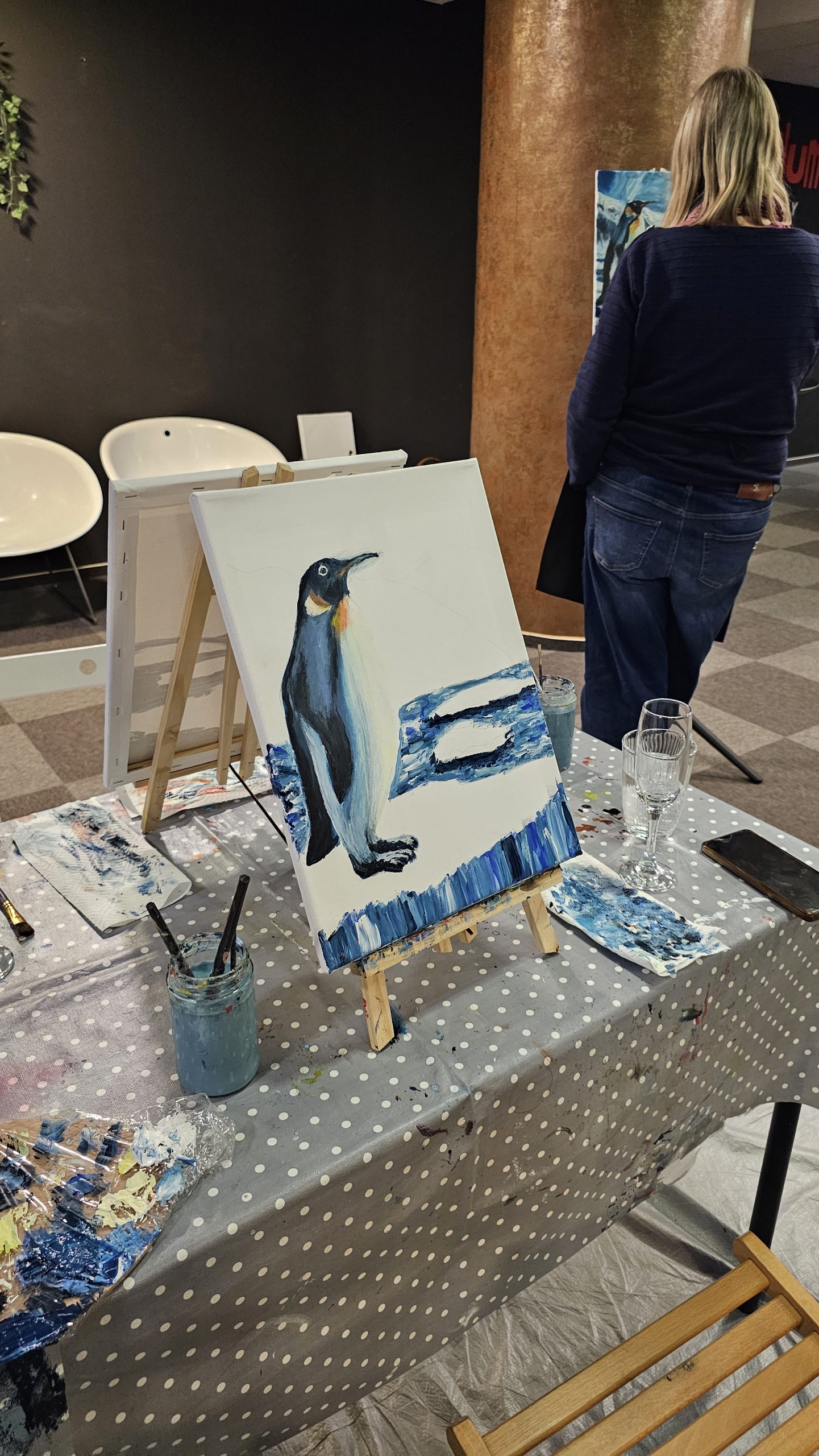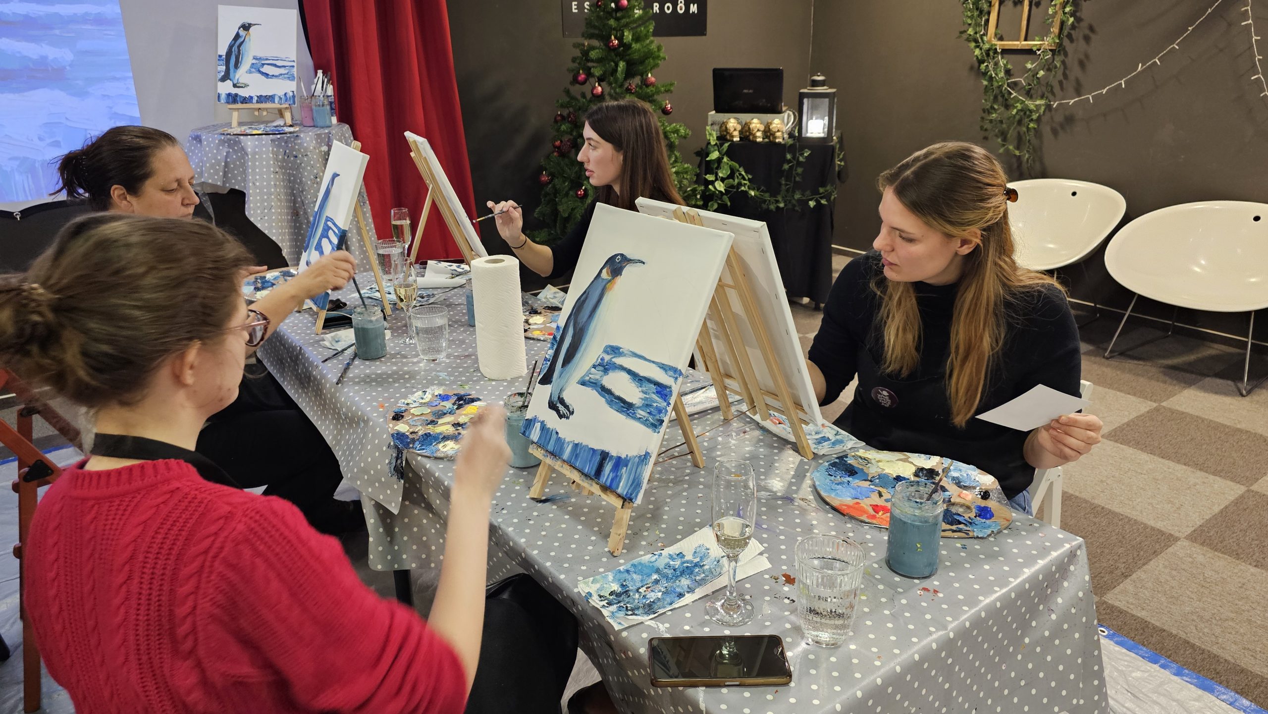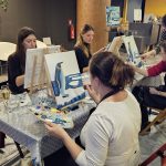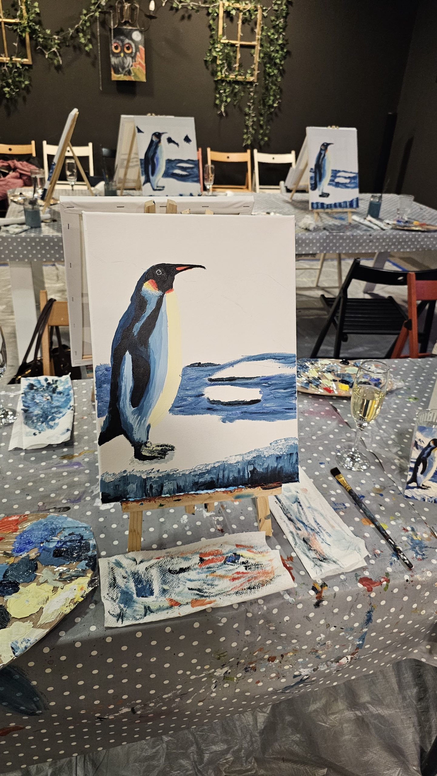 Za odlično vzdušje pa je poskrbel tudi naš Luka, ki je z izjemnim občutkom za detajle zagotovil, da v kozarcih ni zmanjkalo ne čiste vode za čopiče ne kapljice žlahtnega vina.  A kot vedno – ko enkrat začnemo slikati, nas tok ustvarjalnosti tako prevzame, da pozabimo na vse drugo. Tudi na vino.
