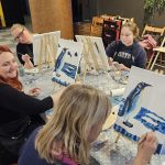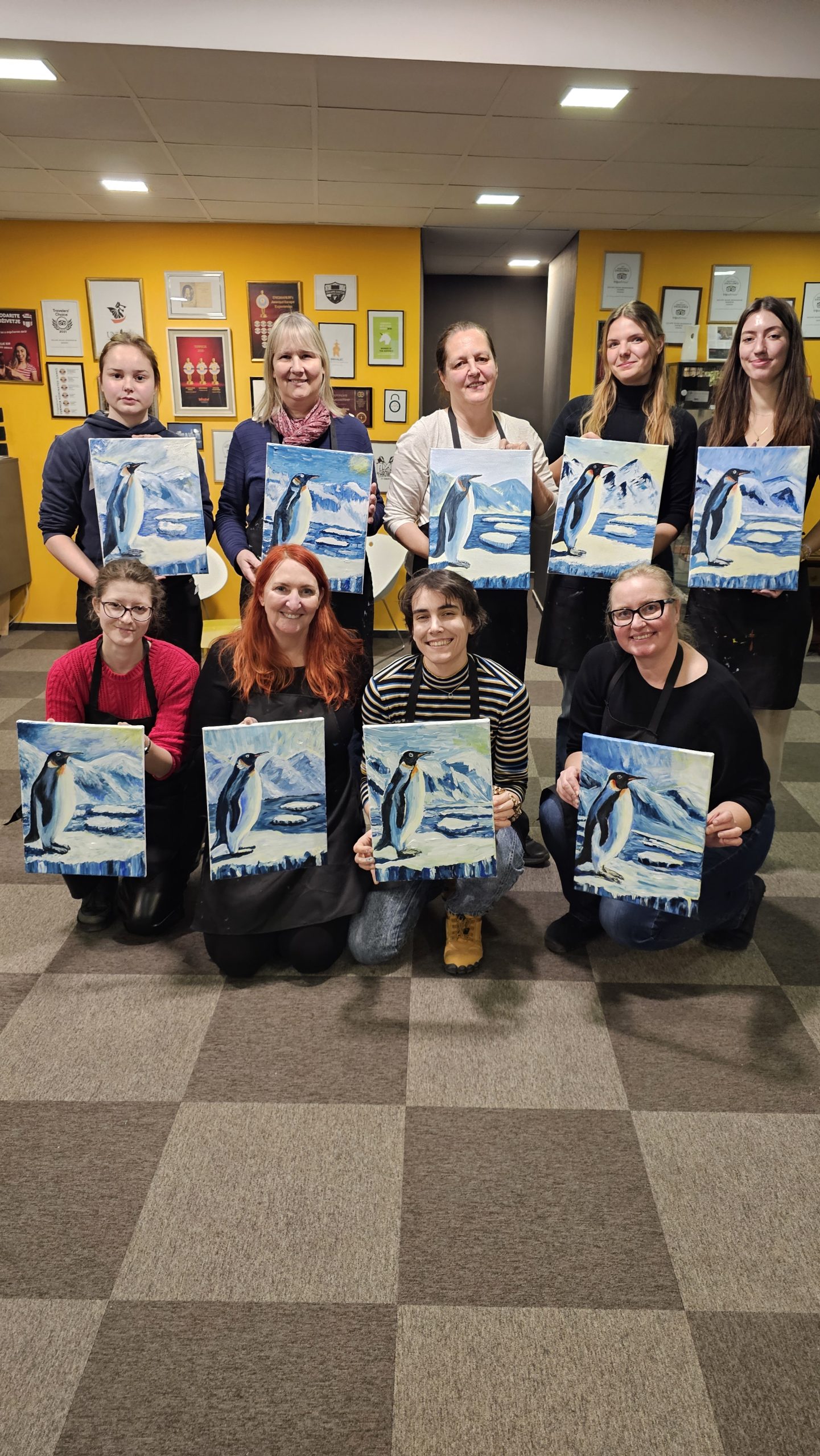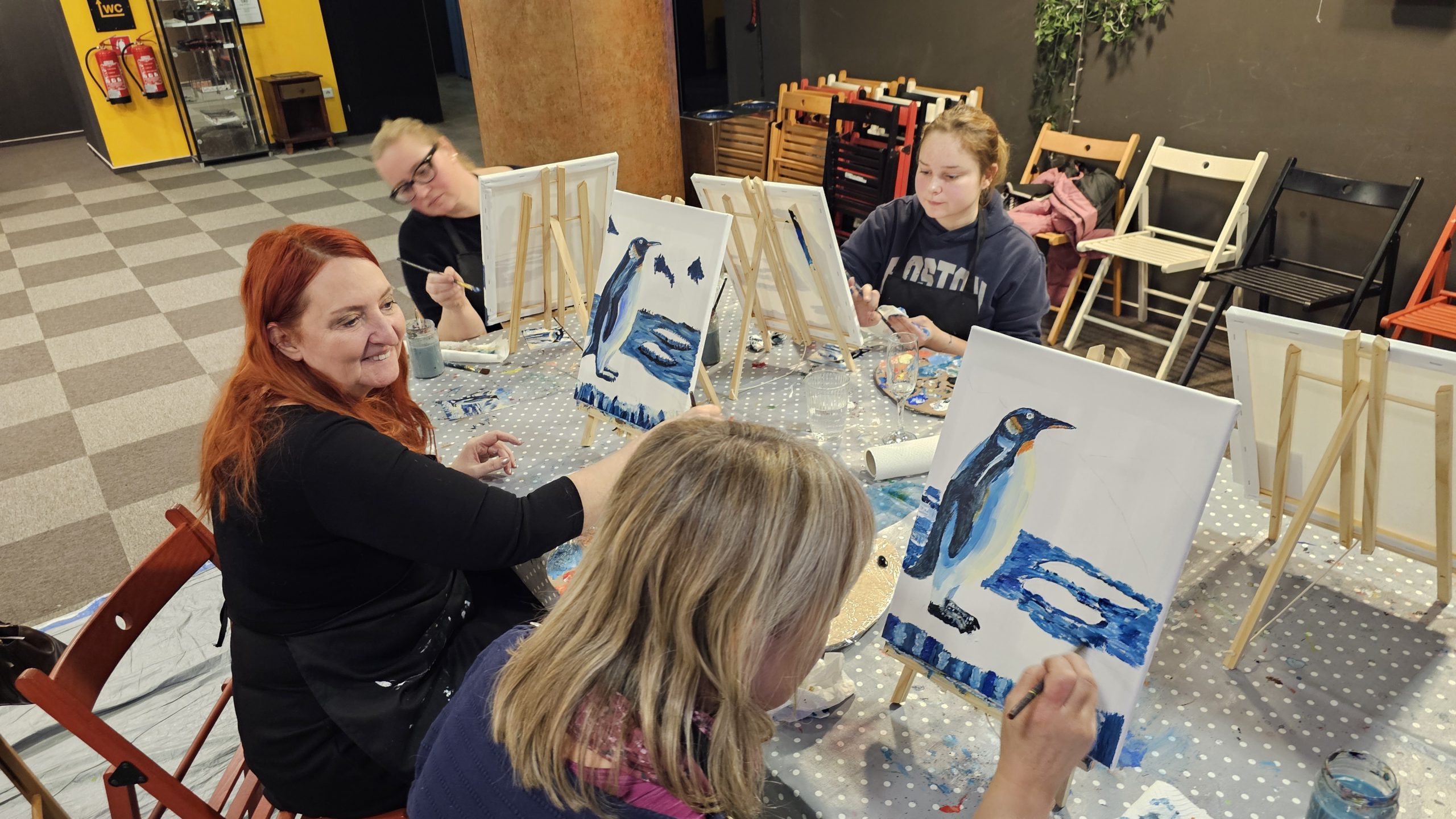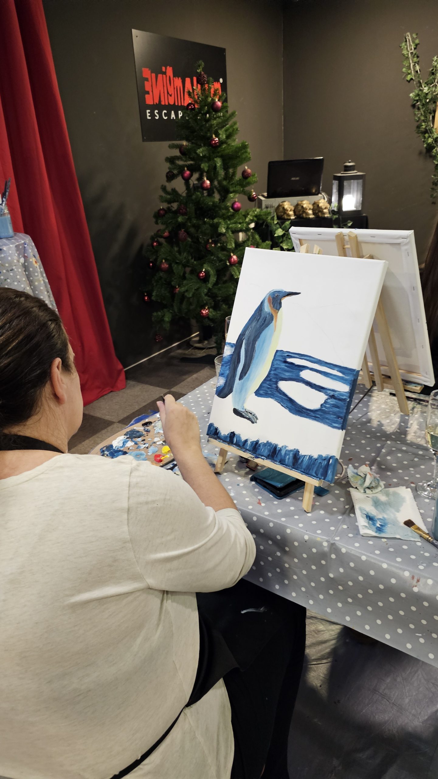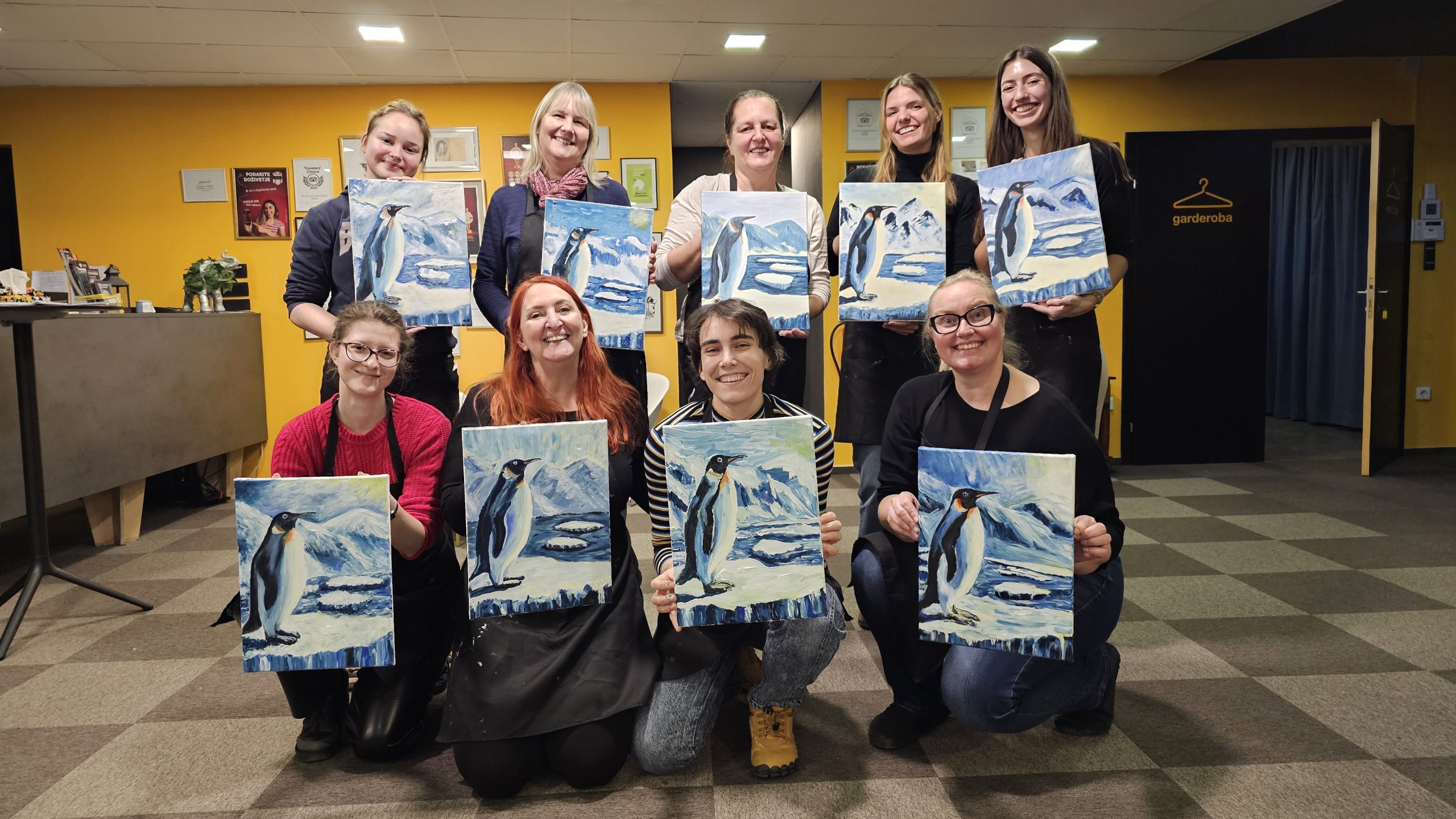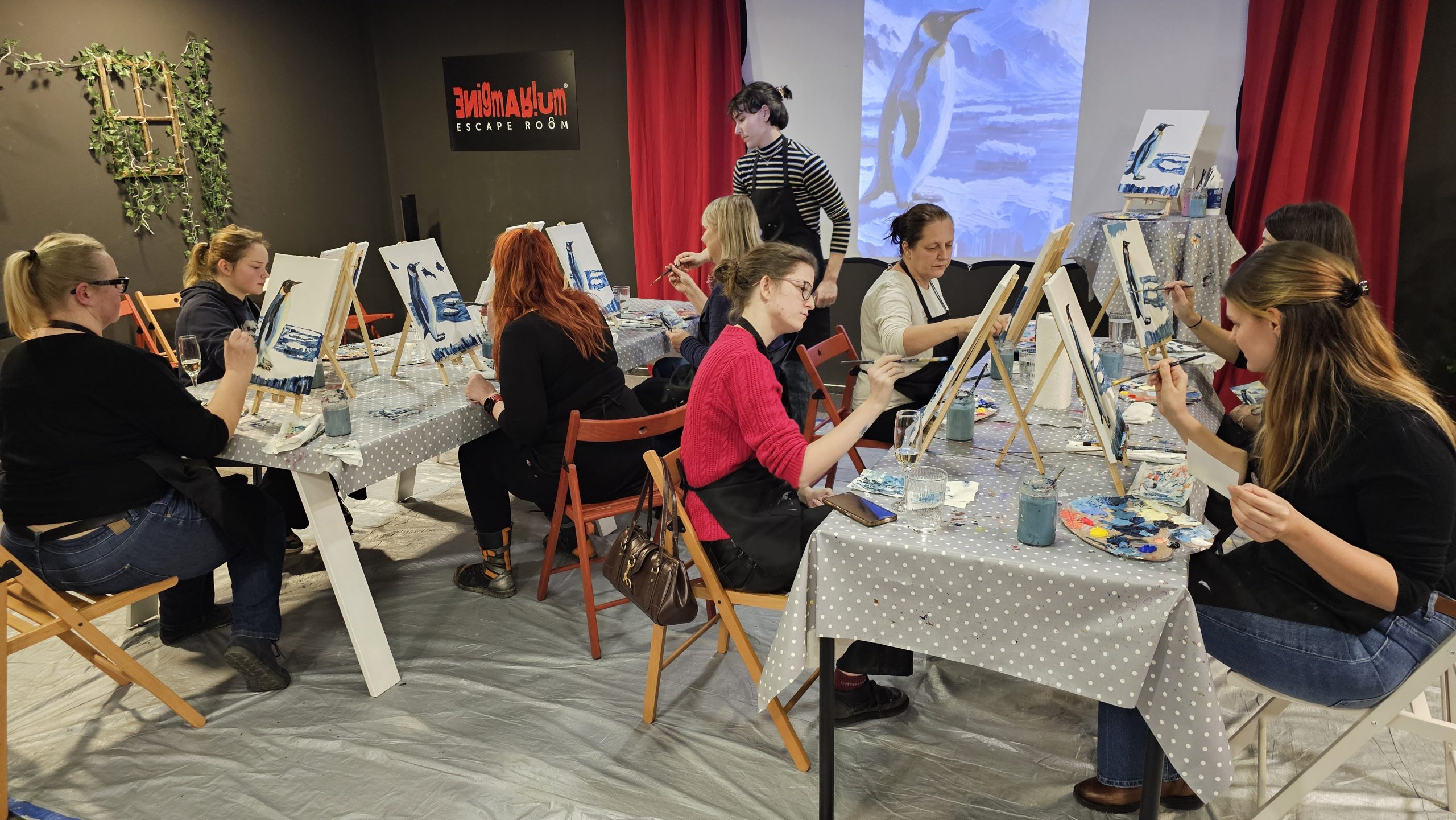 Za odlično vzdušje pa je poskrbel tudi naš Luka, ki je z izjemnim občutkom za detajle zagotovil, da v kozarcih ni zmanjkalo ne čiste vode za čopiče ne kapljice žlahtnega vina.  A kot vedno – ko enkrat začnemo slikati, nas tok ustvarjalnosti tako prevzame, da pozabimo na vse drugo. Tudi na vino.